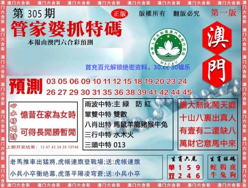 | 301期:🌴三头中特🌴【0-3-4头】开:牛05中 |